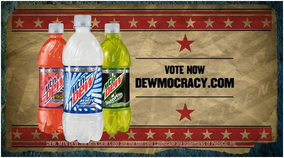 Демократичная рекламная кампания Mountain Dew «Dewmocracy» также дала потребителям возможность самостоятельно контролировать развитие бренда и создать новый вкус напитка. Но в отличие от Lay’s, до начала кампании, 50 самых активных любителей Mountain Dew протестировали 7 экспериментальных вкусов и представили широкой общественности всего 3. Пользователи могли сами выбрать и проголосовать за название нового вкуса, упаковку и даже рекламное агентство, которое будет продвигать новый вкус.