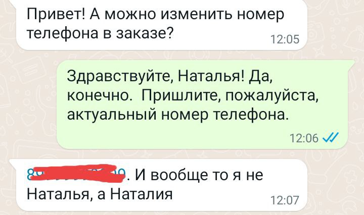 Пример из практики: Саппорт в переписке случайно перепутал имя покупательницы, назвав ее Марина вместо Маринэ. Угадайте, как быстро пришла жалоба? Такие ситуации еще часто происходят с Наталиями и Натальями.