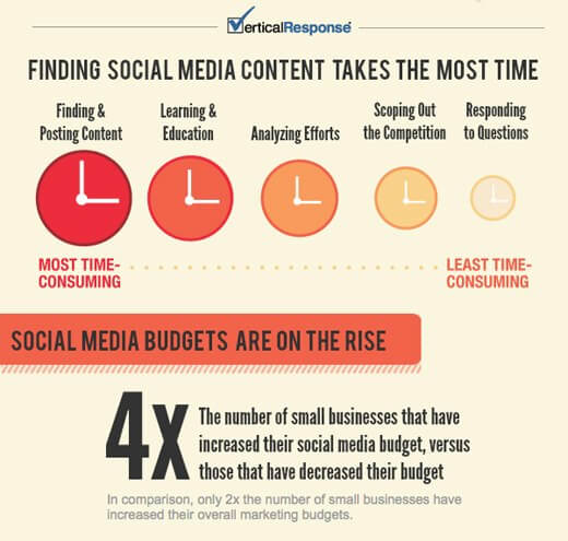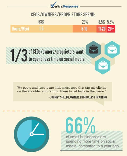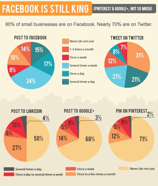 И, тем не менее, на деле, две трети малых контор в текущем году увеличили время, проводимое в соцсетях. При этом 90% из них зависают на Facebook и 70% — в Twitter. Google+ и Pinterest для этих ребят какбэ не существуют (а зря!).