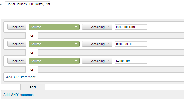 Выбираем «Добавить сегмент», пишем название нового сегмента (например, просто Pinterest, Facebook,Twitter), добавляем их и сохраняем: