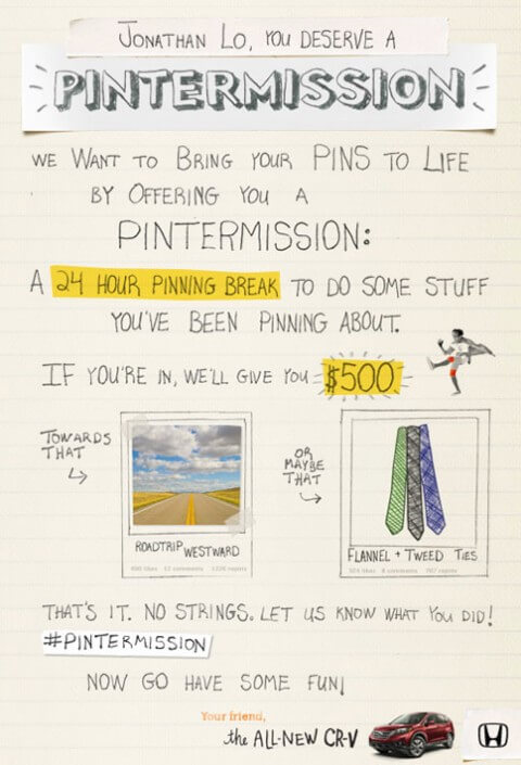 Активным пользователям социальной сети было предложено за один день реализовать идеи, фотографии которых они собирали на своих досках - посетить интересные места или попробовать что-то необычное. Участники, которые приняли участие в авантюре и выложили фотоотчет через мобильный сайт Pinterest с хэштегом #Pintermission , получили $500. А бренд значительно увеличил число своих подписчиков в Pinterest.