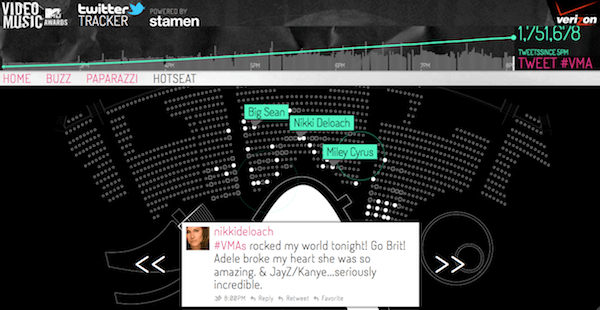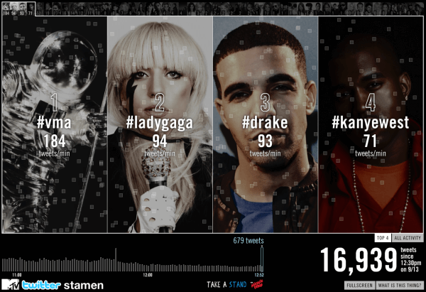 MTV Video Music Awards решили использовать Twitter, чтобы привлечь внимание зрителей к ежегодной церемонии награждения лучших видеоклипов. Специально по случаю шоу был разработан сервис . С помощью него зрители в режиме реального времени могут отслеживать, сколько раз пользователи Twitter упоминают того или иного артиста.