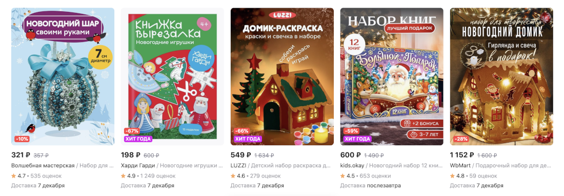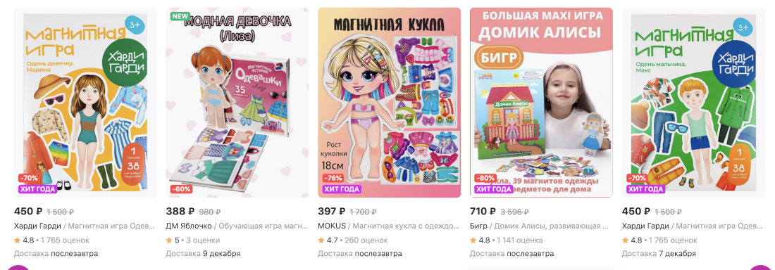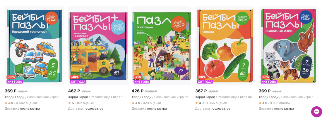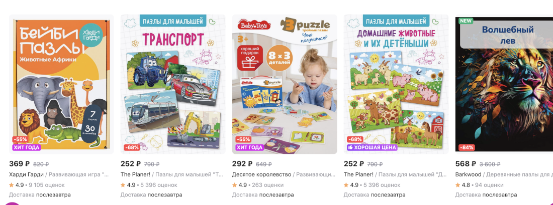 Например, мы в карточках с пазлами указываем не только размеры, но и показываем пазлы на фото в руках детей и взрослых. Многие покупатели не держат под рукой линейку, поэтому сведения о размере изделия в сантиметрах бывают недостаточно информативны. Размер товара и его комплектация должны быть понятны сразу.