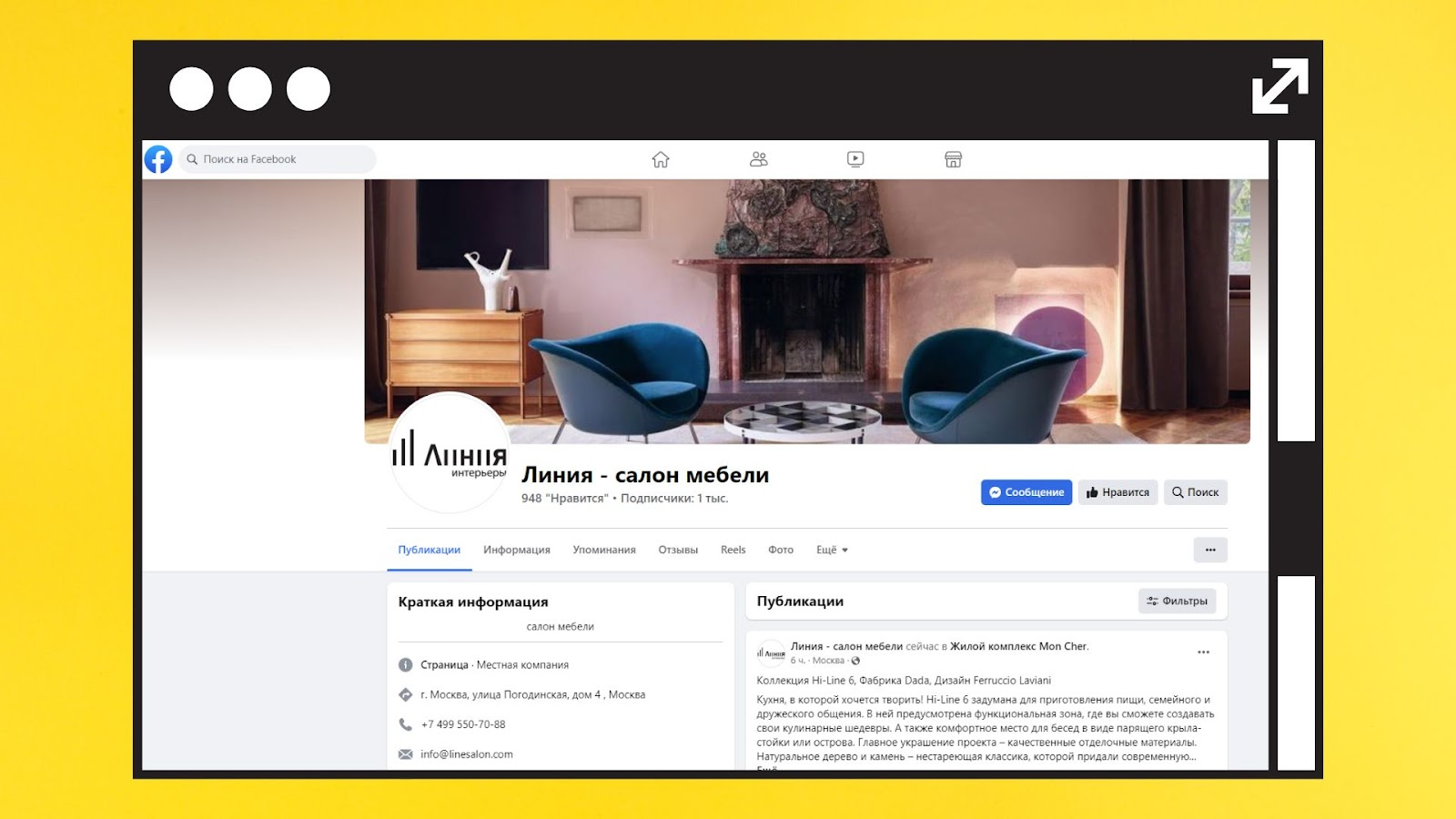 Обложка страницы. Для макета желательно использовать разрешение 1640х856 px и в соотношении 1,91:1. Часто российские бренды не обращают должного внимания к этому инструменту на Facebook*, но мы рекомендуем размещать на баннерах актуальную информацию в конкретный период времени (акции) или основные выгоды/преимущества фирмы.
