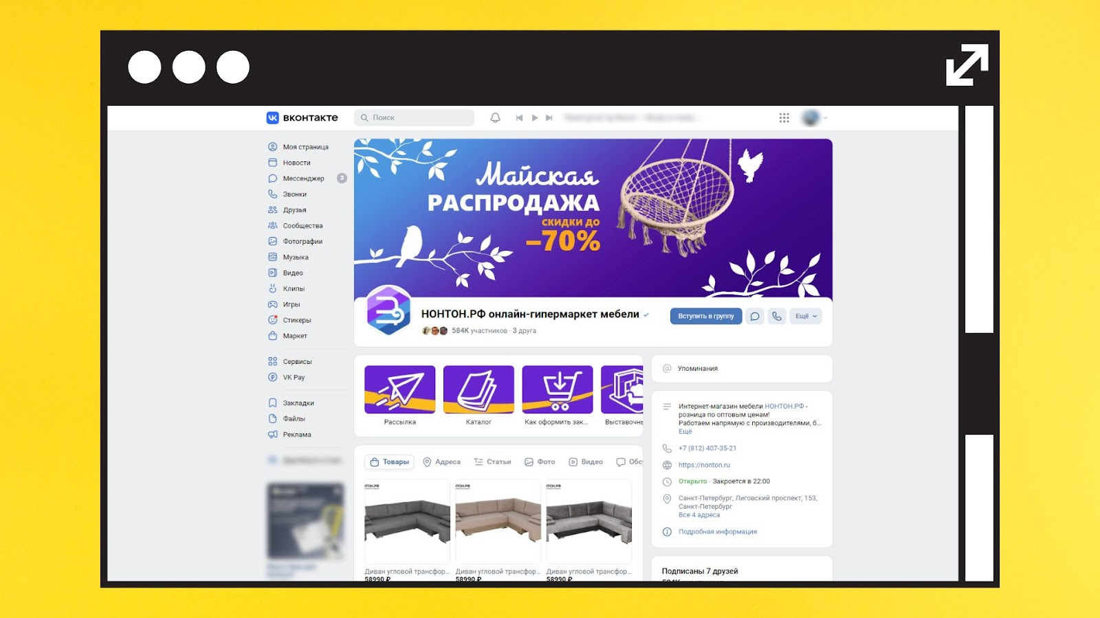 НОНТОН.РФ – онлайн-гипермаркет мебели, где виден профессиональный подход в оформлении страницы ВК. В каждой карточке есть лого компании и артикул для быстрого поиска товаров.