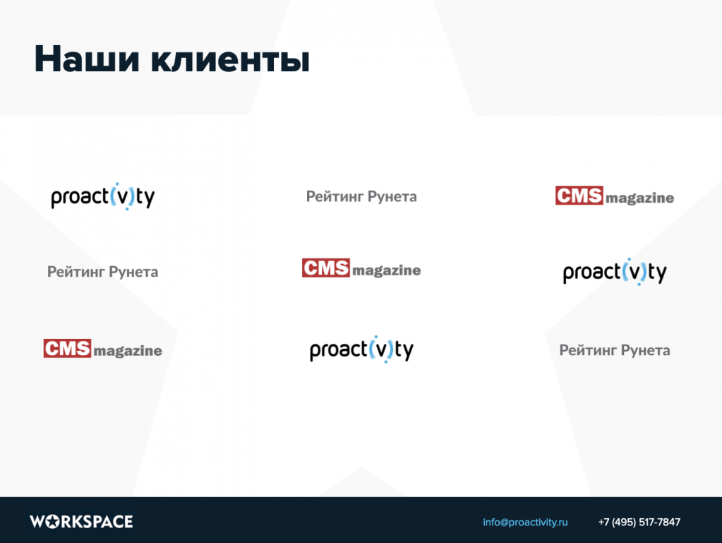 Если вы участвовали в конкурсах, были лауреатом, а тем более выиграли престижную премию, грех не отразить это в коммерческом предложении. Такие социальные доказательства всегда очень хорошо работают и служат в качестве конкурентного преимущества.