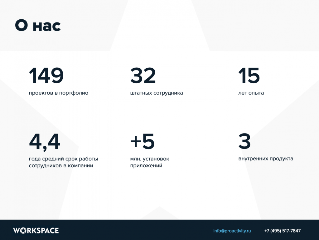Здесь – краткая информация о подрядчике: с конкретикой, цифрами и фактами. Сколько работ выполнено, как давно на рынке, информация о штате и так далее.