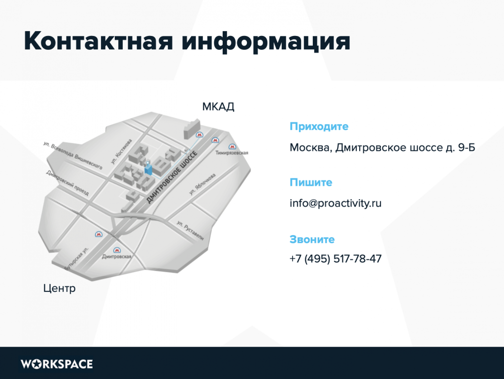 Заключительный раздел коммерческого предложения. Здесь все понятно: перечисляем адреса, телефоны, email, профили в мессенджерах и все остальные способы коммуникации с вами.