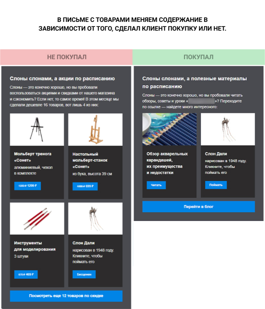 Если человек покупал товар в последние 90 дней – тогда мы на время воздерживались от продающей рассылки, пока подписчику снова не понадобятся наши товары. Чтобы прогреть клиента и напоминать ему о бренде в это время, заменяли акционные блоки на информационные.