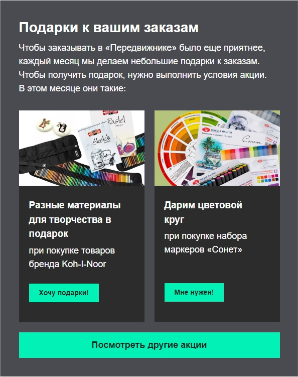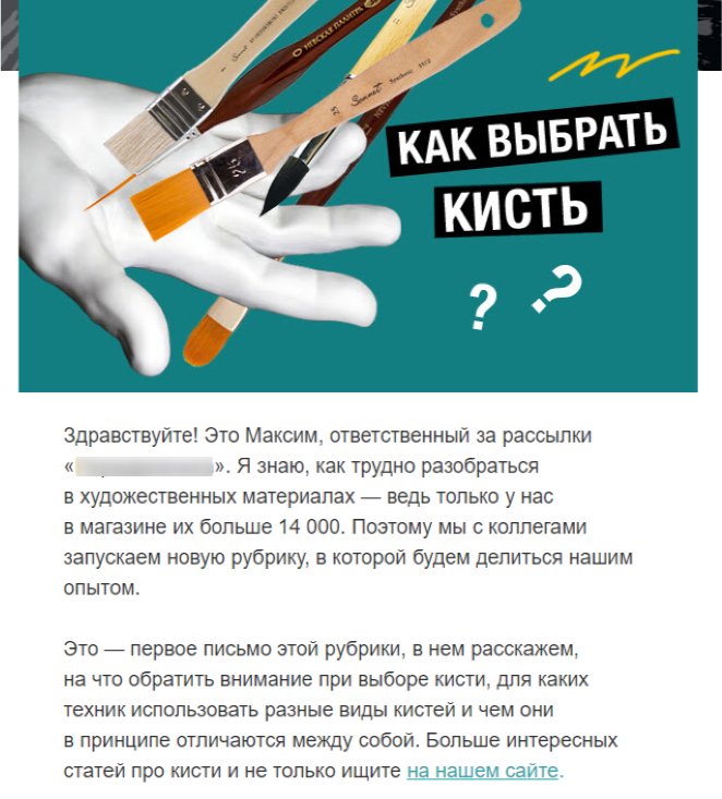 На нашем проекте интернет-магазина профессиональных товаров для художников мы учитываем, как правильно обращаться к пользователю, какая информация ему полезна, как часто он хочет получать письма и т. д. При этом мы стараемся не перегружать читателя и соблюдать баланс: