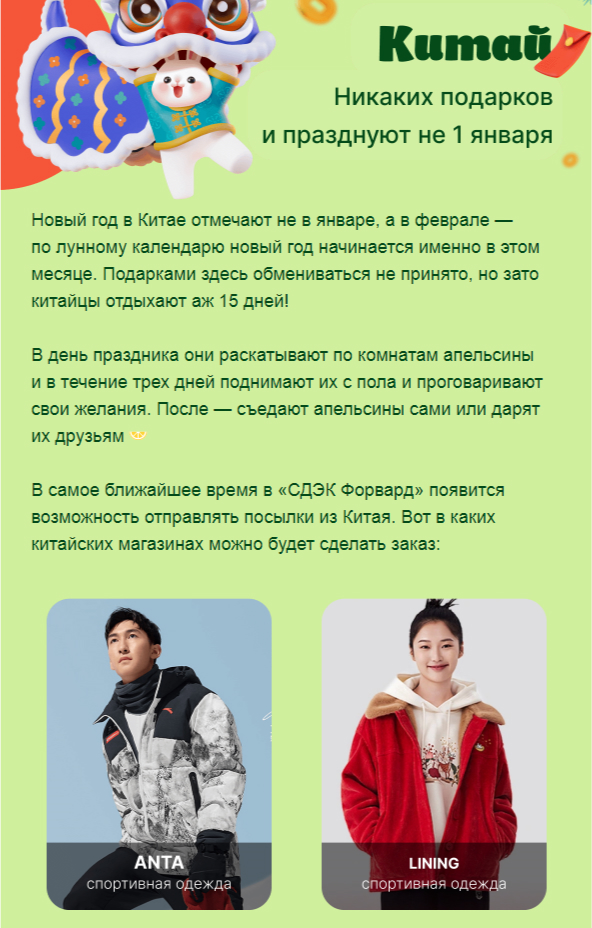 В рассылке «Как празднуют Новый год разные страны?» под блоком с Китаем предлагаем пользователям товары – это один из немногих промоблоков во всем письме