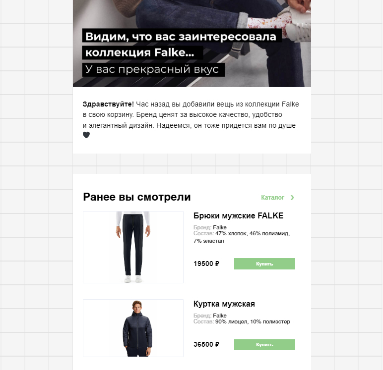 У нашего клиента – официального представителя спортивной брендовой одежды в Москве – в письме автоматически формируются товары и текст письма в зависимости от добавленного в корзину бренда. Например, если пользователь добавил в корзину вещи от FALKE, то в письме рекомендуются вещи только от этого бренда. Такое решение увеличило CR в покупку на 14%.