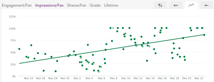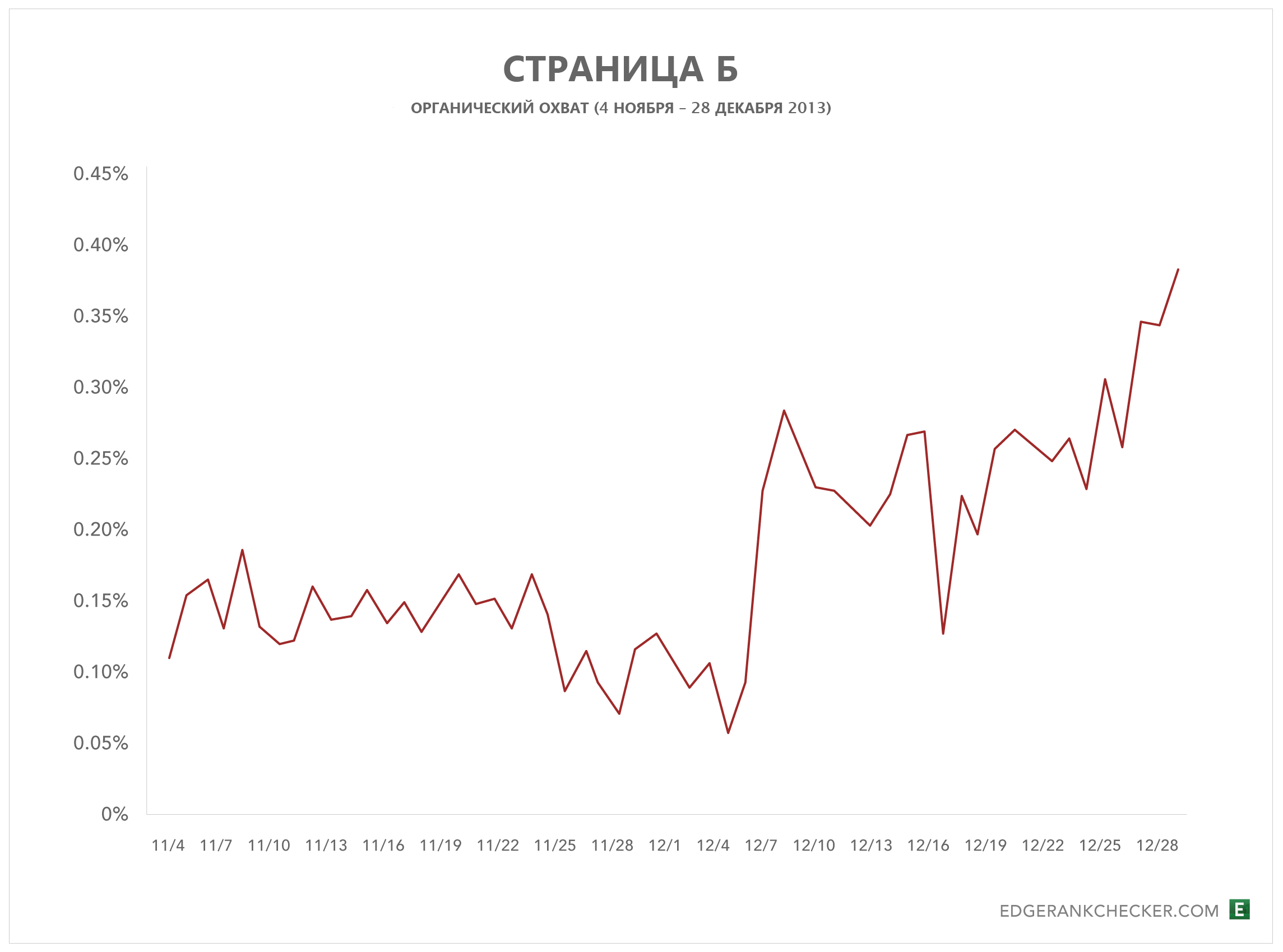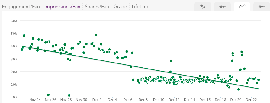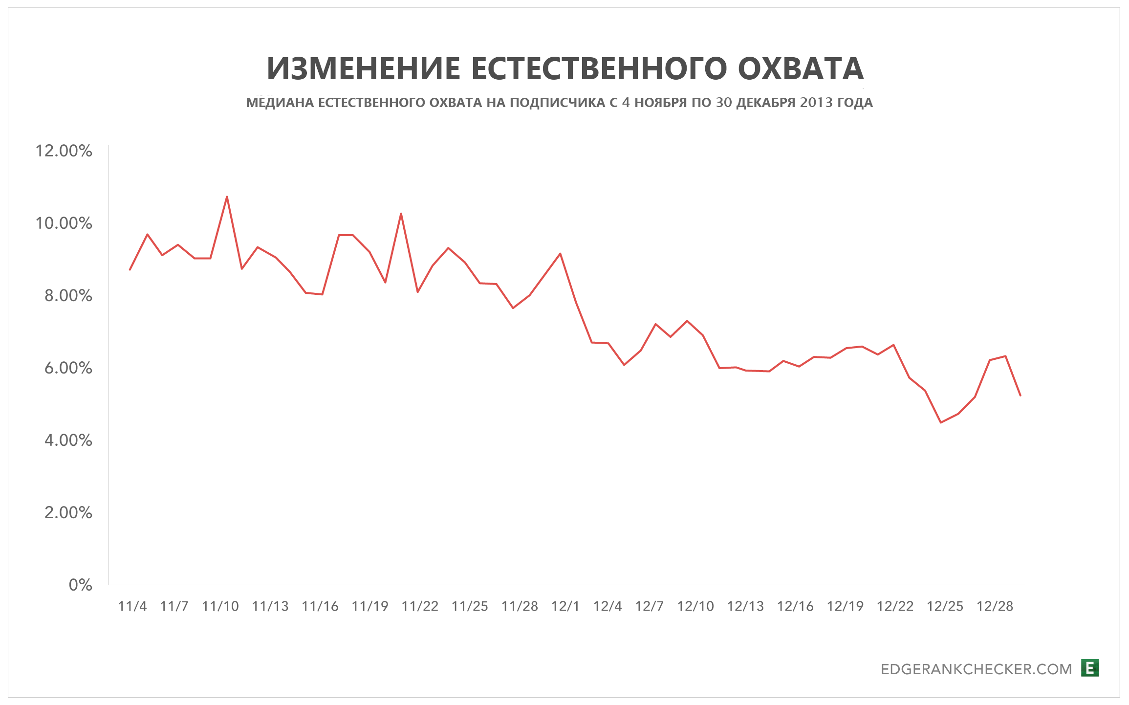 В районе 8 декабря 2013 года естественный охват публикаций на странице вырос. С этого момента количество постов с высоким охватом только увеличилось (наш инструмент округлил их до 100% показов).