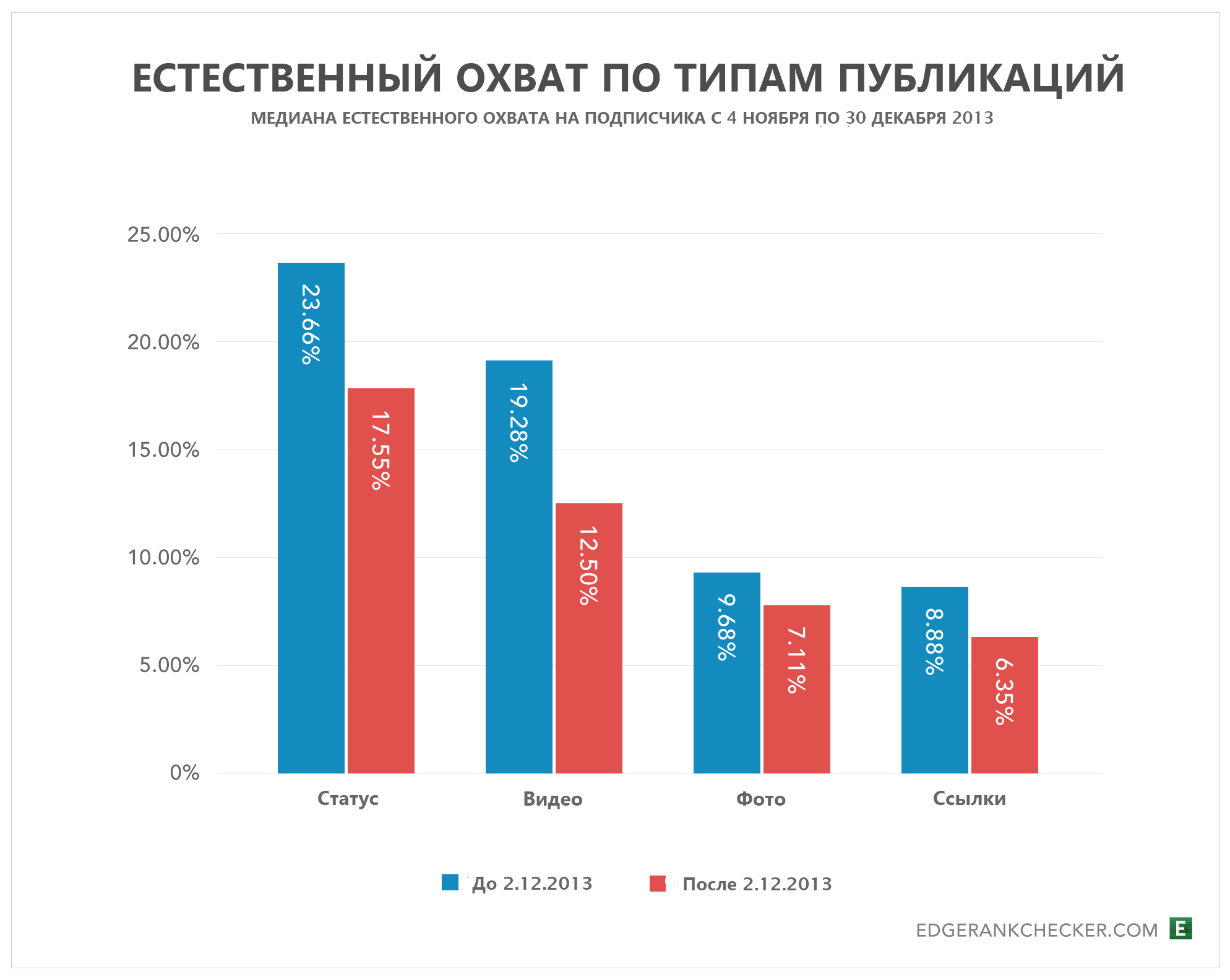 2 декабря 2013 года Facebook сообщил, что будет делать акцент на ссылки в Ленте. Примерно в это же время администраторы многих страниц по всему миру заметили значительное снижение естественного охвата.