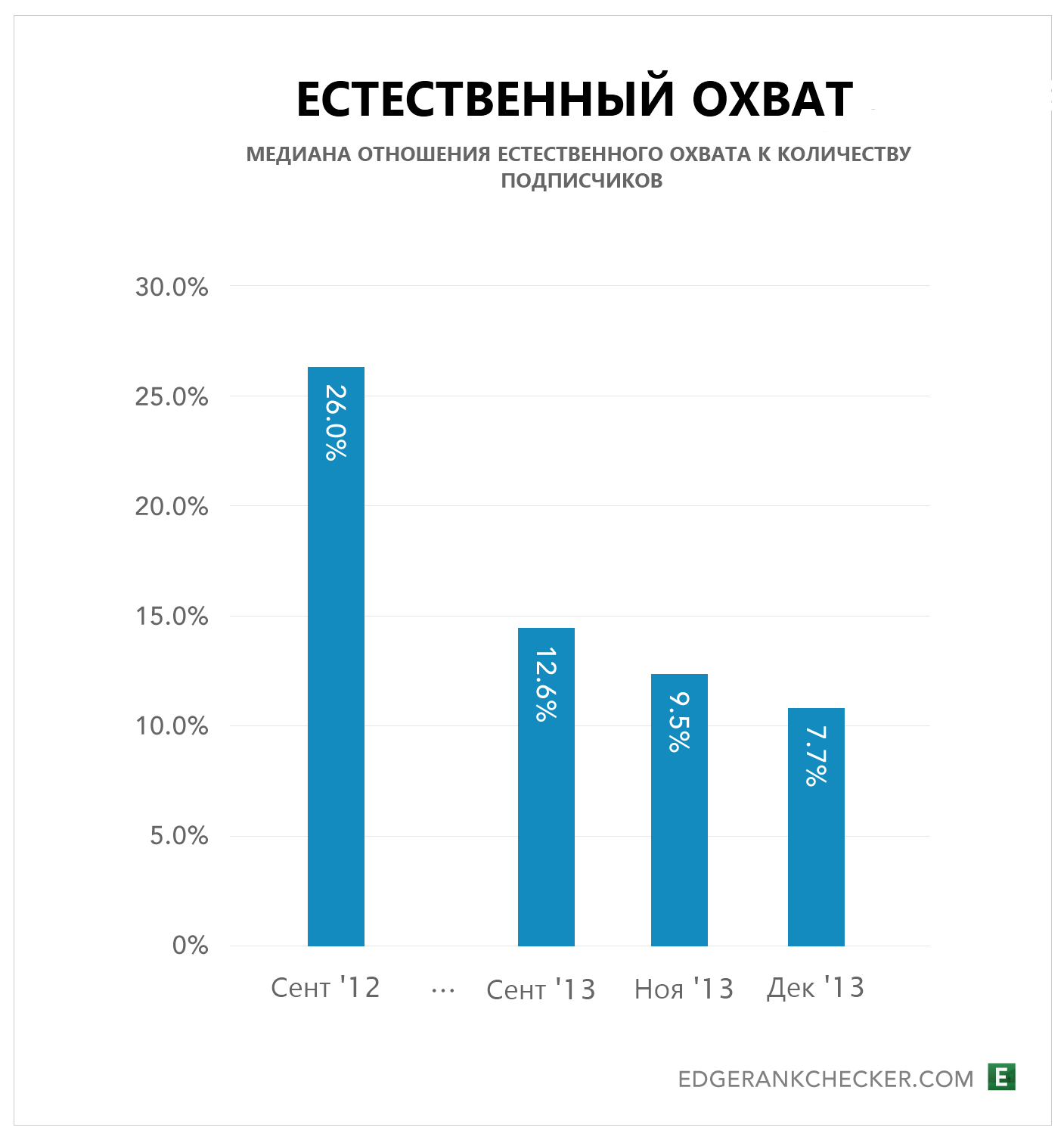 На диаграмме ниже приведено сравнение данных начиная с сентября 2012 года. Буквально год назад дела с органическим охватом обстояли лучше, чем сейчас — наблюдаем падение с 12,6% до 7,7%.
