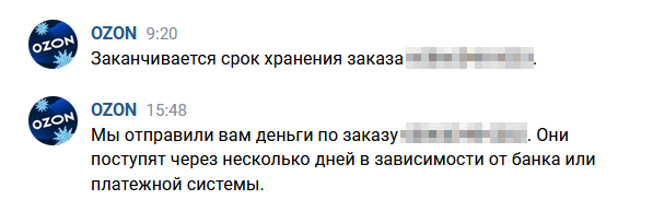 Пример от OZON: компания присылает уведомления о заказе в личные сообщения ВКонтакте