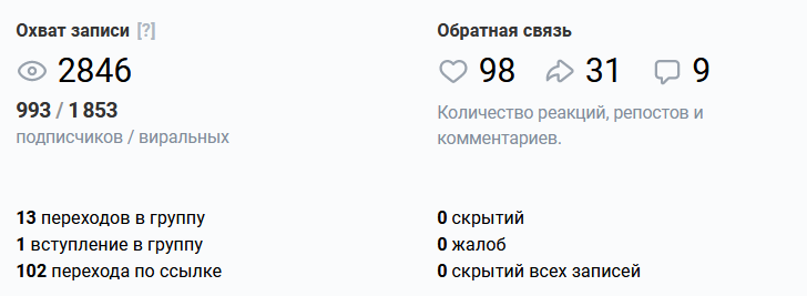 Пример статистики записи ВКонтакте. В публикации стояла ссылка на товар со скидкой: по ней перешли 102 человека