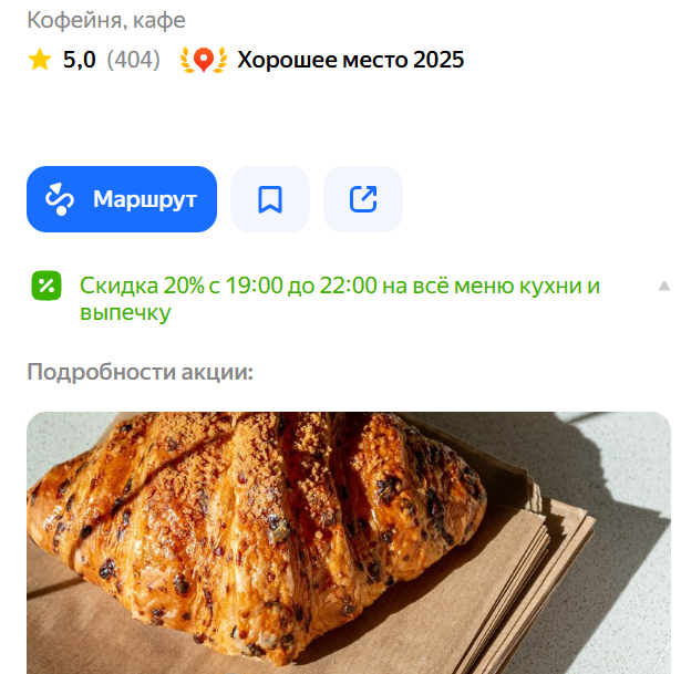 Карточка на Яндекс Картах нужна, чтобы оперативно сообщать о ежедневно меняющихся акциях, которые на сайте описаны в общем разделе. Например, клиент видит: «Скидка на выпечку сегодня с 19 до 22» – и может сразу забронировать столик через сайт или звонок. В карточке также указан график работы с 08:00 до 22:00. Есть более 50 фотографий зала, отзывы и пометки: еда навынос, кофе с собой, Wi-Fi.