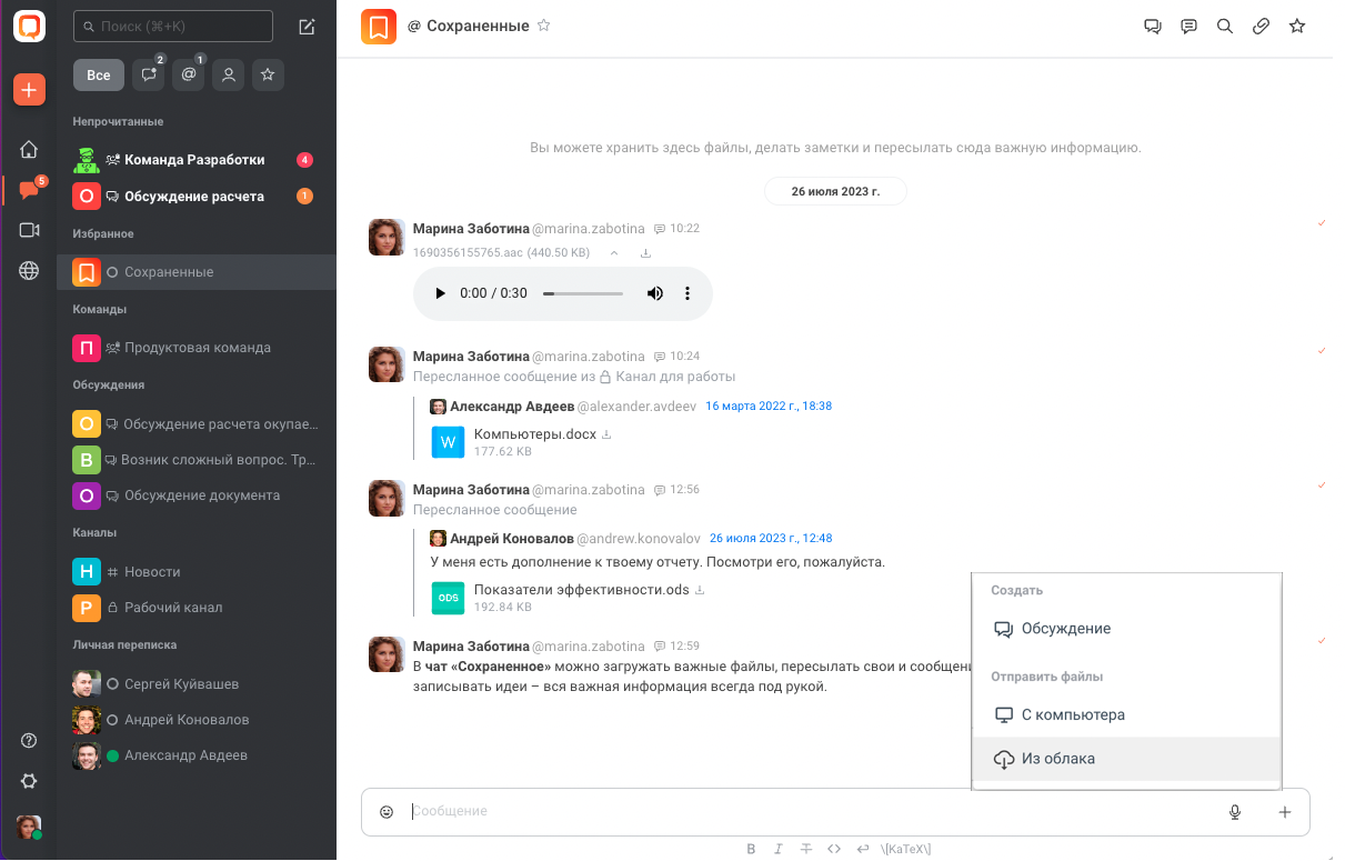 В чате возможен обмен файлами, а для корпоративных обсуждений поддерживаются треды, теги, а также стикеры и реакции (возможна загрузка собственных наборов). Естественно, присутствует возможность создания корпоративных каналов, упоминание нескольких пользователей или всех участников. Для расширения возможностей можно использовать интеграцию с популярными корпоративными сервисами и бизнес-системами. Решение доступно для всех популярных операционных систем.