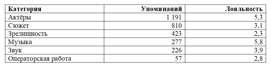 Из этого вытекает и популярность различных сторон картины, которые зрители также отметили. Традиционно больше внимания тому, что видно. Для удобства чтения приведем таблицу упоминаемости и лояльности по категориям. Лояльность – это соотношение количества позитивных и негативных упоминаний. Соответственно, чем больше, тем лучше. Если меньше одного, то критики было больше.