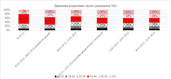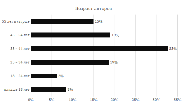 Интересно отметить, как менялся возрастной состав авторов от недели к неделе. На протяжении всего периода среди них были наиболее активны пользователи 35–44 лет, преимущественно женщины.