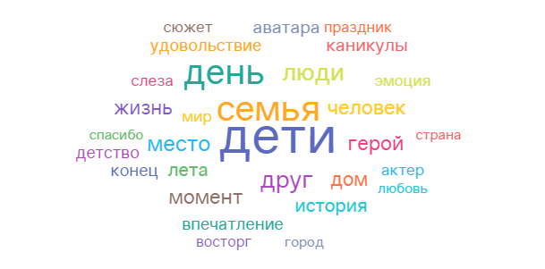 Можем заключить, что подавляющее большинство зрителей в своих сообщениях картину хвалили и делились трогательными комментариями. Чаще всего писали женщины среднего возраста (главные SMM-щицы российских домохозяйств). Многие упоминали, что посетили картину с дочерями. Малая доля зрителей (0,09%) написали посты в соцсетях о посещении картины. Один автор, как правило, говорил от лица семьи, 2 – 4 и более человек. Пожалуй, лучшей иллюстрацией станет облако слов, характерное для постов зрителей.