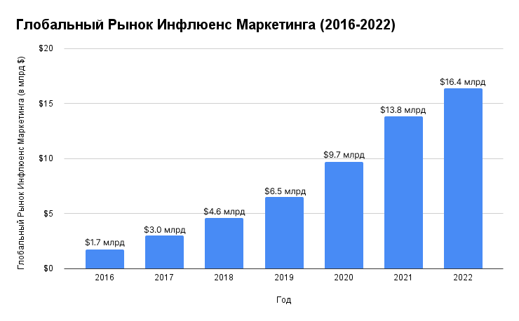 Роберт Палматиер, профессор Школы Бизнеса Университета Вашингтона, считает, что инфлюенс-маркетинг приносит самый высокий ROI по сравнению с другими видами продвижения. Влияние инфлюенс-маркетинга нельзя недооценить – 71% людей доверяют рекламе от инфлюенсеров, что подтверждают и траты маркетологов. В 2022 году рынок инфлюенс-маркетинга оценивается в $16,4 млрд, что на 18,8% больше, чем в 2021 году. Согласно экспертам, тенденция на увеличение этого рынка не только не замедлится, но и у увеличится на 53% в 2023 году.