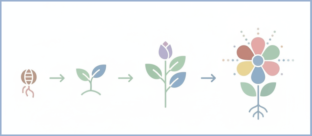 «Современная инфографика о росте растений от семечка к цветку, минимализм, пастельные тона, схематичные иконки, белый фон, без текста»:
