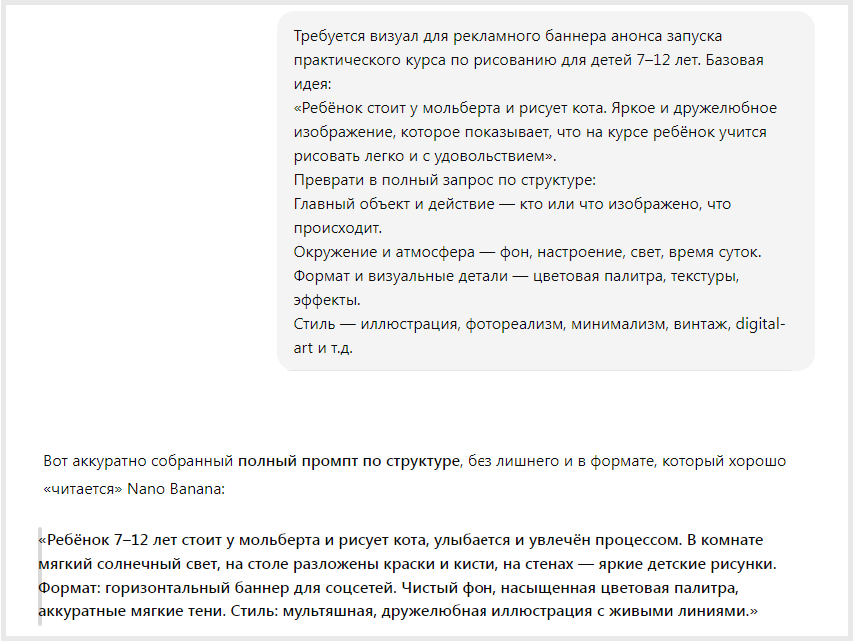 Результат работы с Nano Banana во многом зависит от того, как сформулирована задача. Чтобы созданное изображение действительно ее решало, важно грамотно составить промпт – по сути, ТЗ для нейросети. Четкий и логично выстроенный запрос позволяет получить результат, максимально близкий к ожидаемому, и заметно сокращает время на повторные генерации.