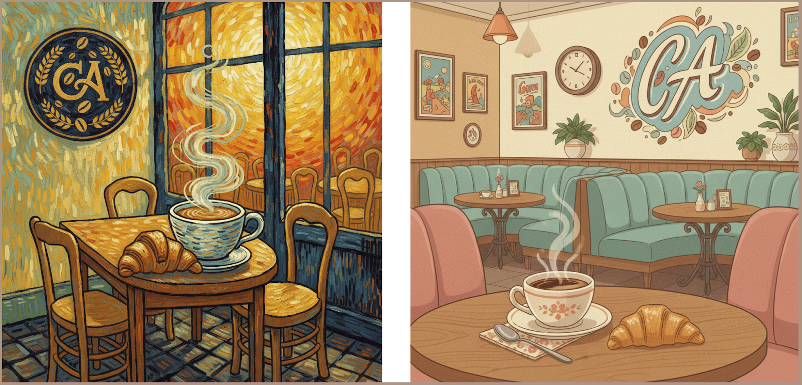 1. «Уютный интерьер кафе с чашкой кофе и круассаном на столе, логотип бренда «СА» на стене. Теплый свет, дружелюбная атмосфера. Яркие контрастные цвета, вихревые мазки, экспрессия. Иллюстрация, в стиле Ван Гога».