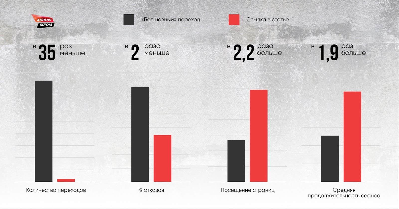 Несмотря на существенный перевес, пользователи, перешедшие по метке в статье, демонстрировали лучшие показатели трафика по сравнению с теми, кто попал на сайт «бесшовно»: