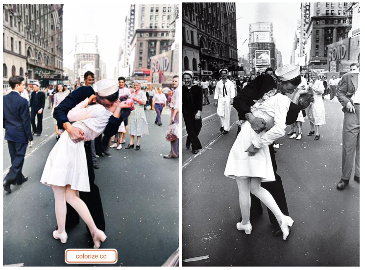 Вот такой реалистичный результат на примере знаменитой фотографии Альфреда Эйзенштадта «Поцелуй на Таймс-сквер».