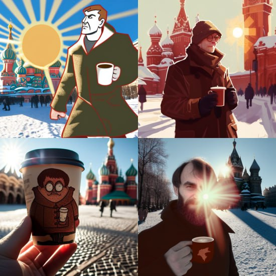 Результат – ниже. Главную площадь страны нейросеть реализовала довольно точно (есть миллионы изображений в сети, тут не ошибешься). А дальше начались нюансы. То герои в стиле советских плакатов, то бомжеватого вида парнишка в очках, то странный персонаж на стаканчике прямиком из «Южного парка». Видно имитацию прорисовки кистью. Третий и четвертый варианты больше похожи на реальные фотографии. И снова те же странности с пальцами.