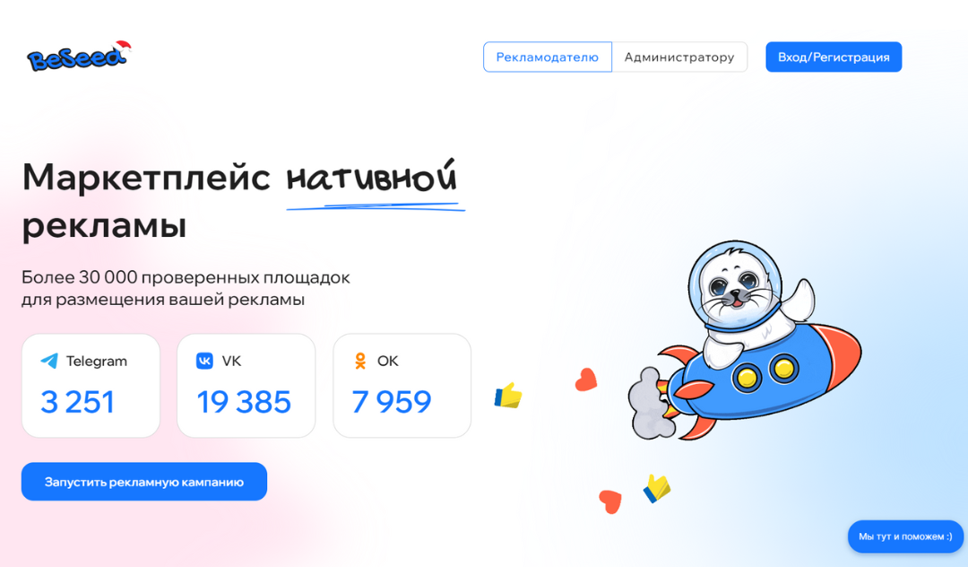 Нерпа хорошо устроилась на сайте: для рекламодателей она запускает «космические» рекламные кампании (скриншот слева), а для администраторов – следит за рекламным кабинетом и считает заработанные на нативной рекламе средства.