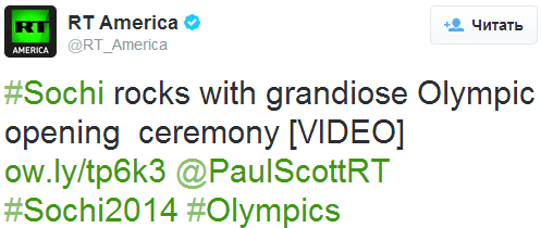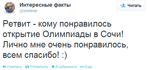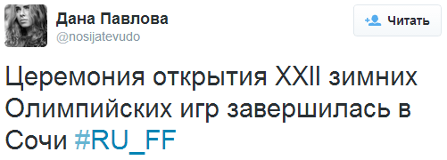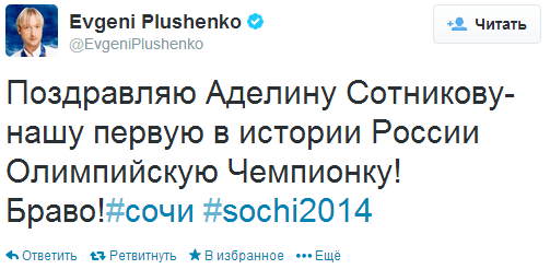 Наиболее популярные позитивные упоминания в русском сегменте связаны с восторгом, вызванным церемонией открытия игр (рисунок 2), а также с радостью, вызванной первым «золотом» России. Твит о первой победе опубликовал @EvgeniPlushenko (рисунок 3).