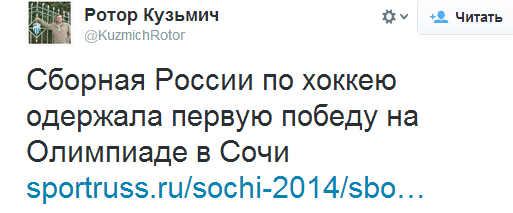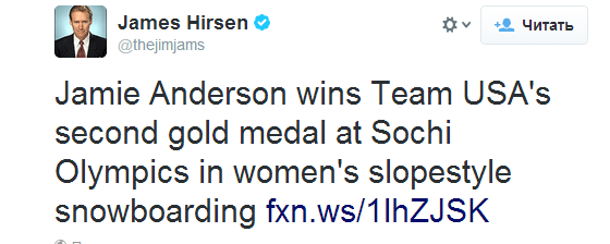 - Обсуждение соревнований и спортсменов. Публикации новостей о соревнованиях, медальном зачёте, а также об успехах и неудачах спортсменов. Например, твиты о первой победе сборной России по хоккею и втором «золоте» Джейми Андерсон для копилки команды США.
