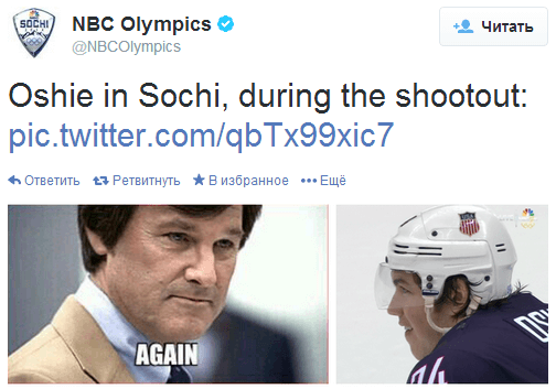 V. На пятом месте твит от @NBCOlympics об Oshie во время буллитов.