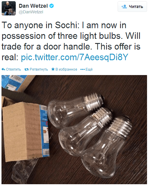 III. Третье место за курьёзом @DanWetzel, который нашел в своём номере три лампочки и предлагал их обменять на дверную ручку.