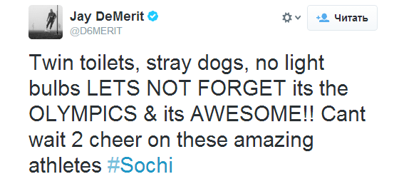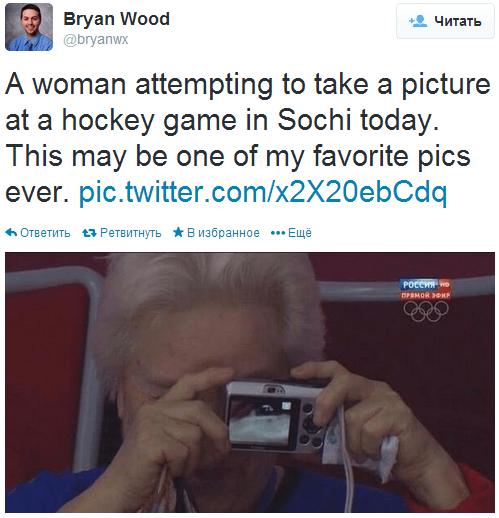 - Обсуждение курьёзных моментов. Пользователями Twitter очень живо обсуждались различные комичные события или случаи, замеченные или пережитые ими во время зимних Олимпийских игр. Например, новости о том, как не раскрылась снежинка в кольцо, либо как бобслеист Джонни Куинн застрял сначала в душевой, а позже — в лифте.