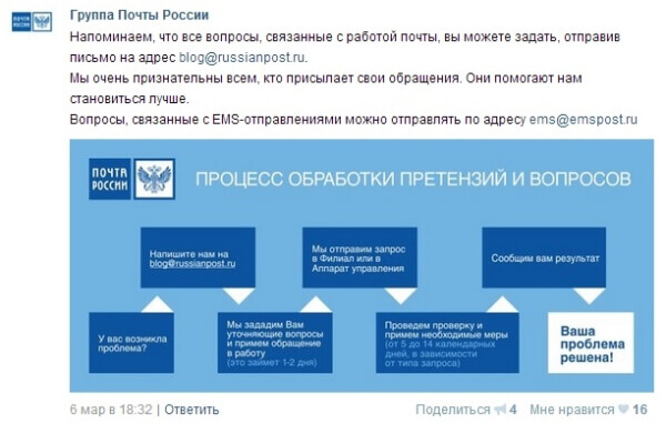 Кстати, у «Почты России» есть официальное представительство в социальной сети ВКонтакте. Первая запись опубликована 18 февраля 2013 года. Однако тут можно высказаться исключительно в комментариях, а с вопросами, связанными с работой «Почты России» отправляют по адресу. Хорошо, что пока хотя бы по электронному.
