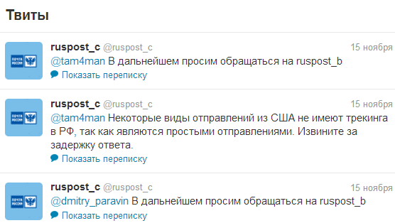 В конце прошлого года «Почта России» обзавелась массой аккаунтов в Twitter: @ruspost_a, @ruspost_b, @ruspost_c, @ruspost_d. Зачем? Они хотели психологически поддерживать своих клиентов.