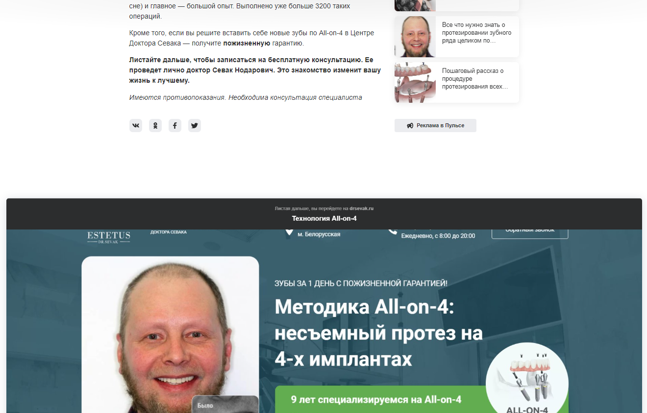 Один из многих примеров продвижения медицинских услуг на Пульсе – кейс московской стоматологической клиники. Ниша достаточно конкурентная, за клиентами охотятся. Чтобы привлечь внимание потенциальных клиентов и мотивировать их обратиться в клинику, были использованы такие приемы: