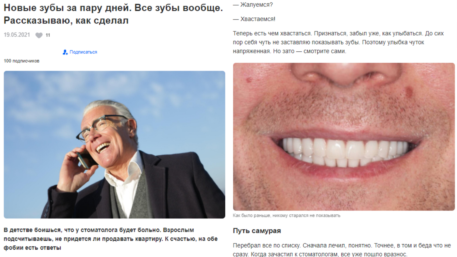 Охватный текст с рассказом о том, как важны здоровые зубы, что происходит в запущенных случаях, почему важно заниматься этим вопросом как можно быстрее, и куда именно обращаться. После такой «подводки» рассказ о клинике не выглядит как реклама, он будто отвечает на вопросы, которые возникли у читателей.