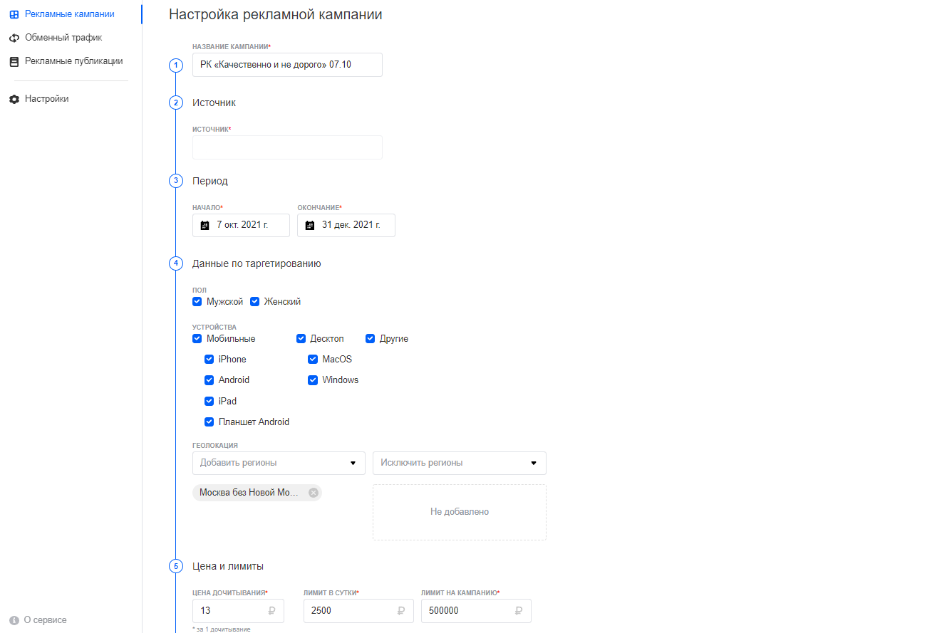 Так выглядит рекламный кабинет Пульса. Всего 3 настройки, а остальное на себя берет контент и умный алгоритм
