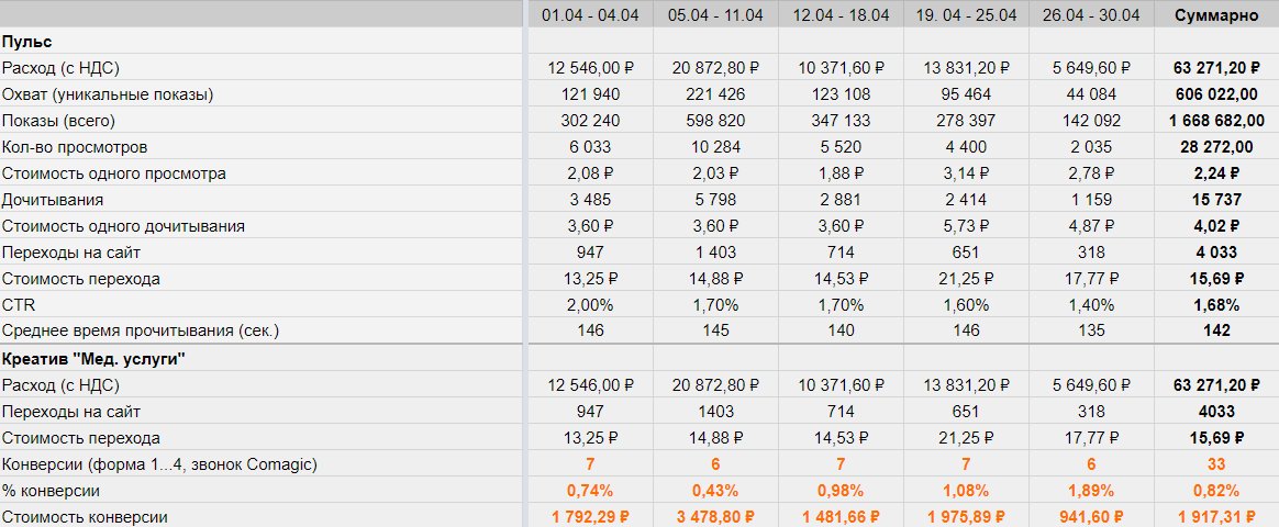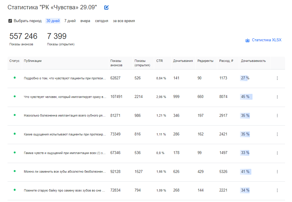 Оптимизация – добавление новых обложек, иногда иллюстраций в тексты, правки и даже частичное переписывание текстов, игра ставками, управление показами. Результативность рекламы на Пульсе сильно зависит от нюансов.