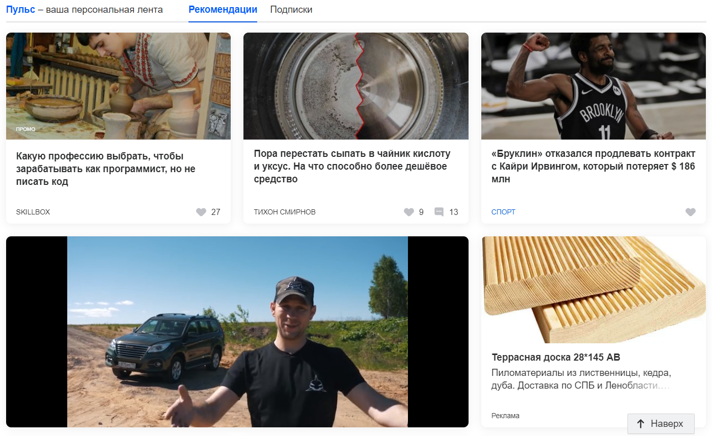 Пульс – это рекомендательный сервис, то есть он сам определяет, кому, что и когда показывать. Такая система работает не совсем как телевизор – включи и смотри. Каждый пользователь видит целую ленту предложений. Все они не случайны, отобраны по его предыдущим интересам, просмотрам, реакциям. Но что именно человек откроет и прочитает, зависит уже от его личного выбора.