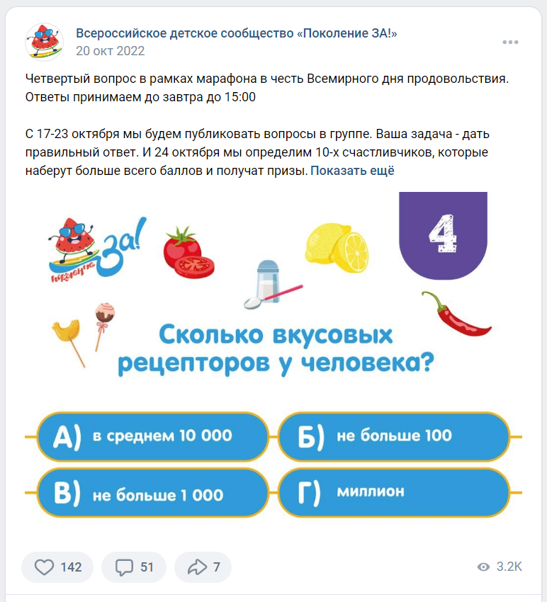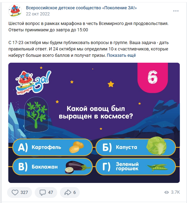 В результате пост получил 44 000 охвата, 130 лайков и 64 репоста, 1000 переходов на вопросы. Участвовало 32 человека.