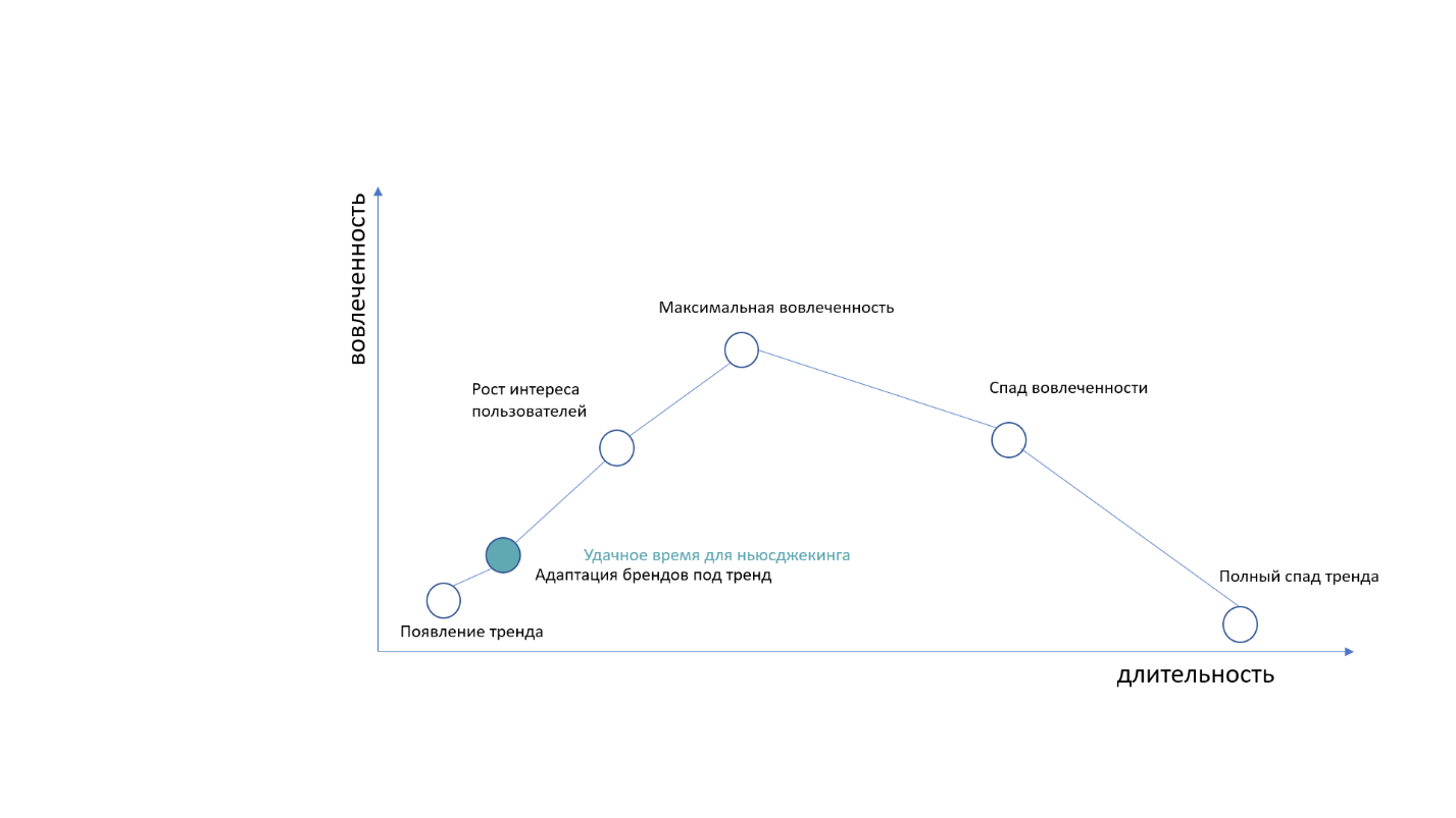 Инструмент ньюсджекинга эффективен, но имеет краткосрочный эффект. Продолжительность жизненного цикла тренда варьируется от 7 до 10 дней в связи с обилием информации и адаптацией инфоповодов различными брендами.