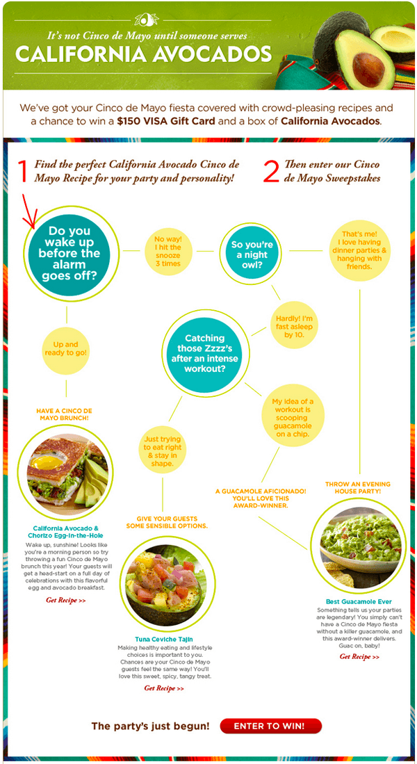 Организация California Avocado Commission выпустила приложение для Facebook, приуроченное к празднику Синко де Майо, который отмечается в Мексике и США. Этот день традиционно празднуют текилой и салатами, в составе которых обязательно есть авокадо. Компания, которая лоббирует интересы производителей авокадо Калифорнии, не могла упустить возможность напомнить о продукции. Организация предложила пользователям поучаствовать в конкурсе и узнать рецепты праздничных блюд.