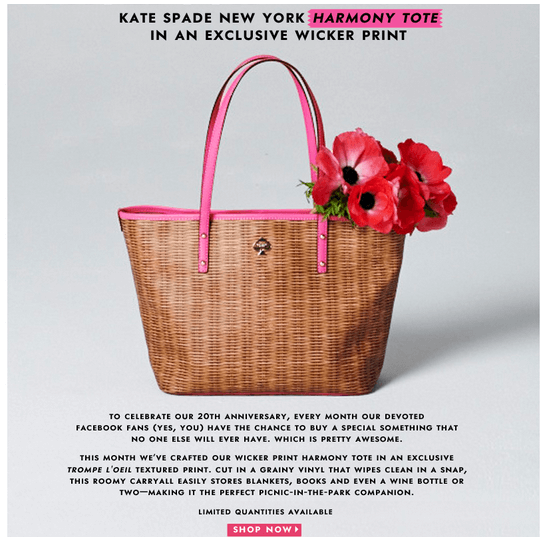 Зачем ждать праздников, когда можно радовать своих пользователей каждый месяц? Kate Spade NY ежемесячно дарит своим подписчикам в Facebook возможность приобрести эксклюзивную вещь. Естественно, каждый раз эта вещь соответствует сезону и отвечает интересам фанов. Вот, например, сейчас они могут приобрести летнюю плетеную сумку с розовой отделкой. Даже не придется затрачивать много усилий, кнопка «Купить сейчас» уже встроена в приложение.